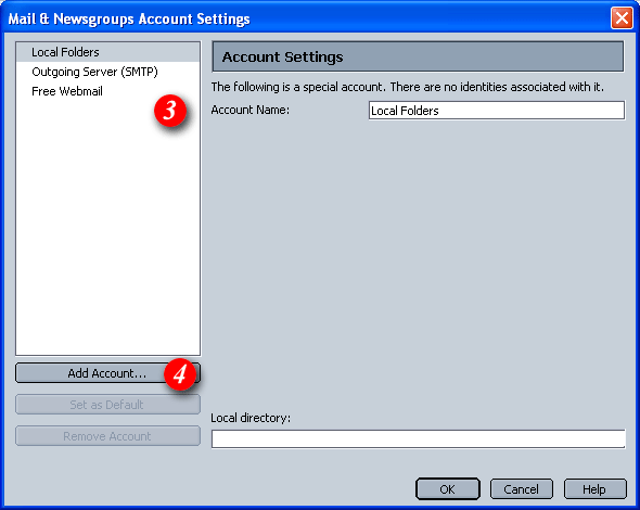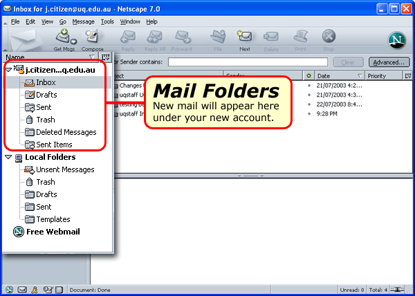 | 3)The left pane displays the accounts and folders you have previously setup. If you're running Netscape or Mozilla for the first time this area will not display any account details (as above). |