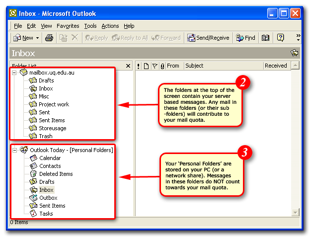2)Examine the 'Folder List' on the left of the screen. The folders at the top of the page contain your server-based messages. Any messages in these directories will contribute to your mail quota.