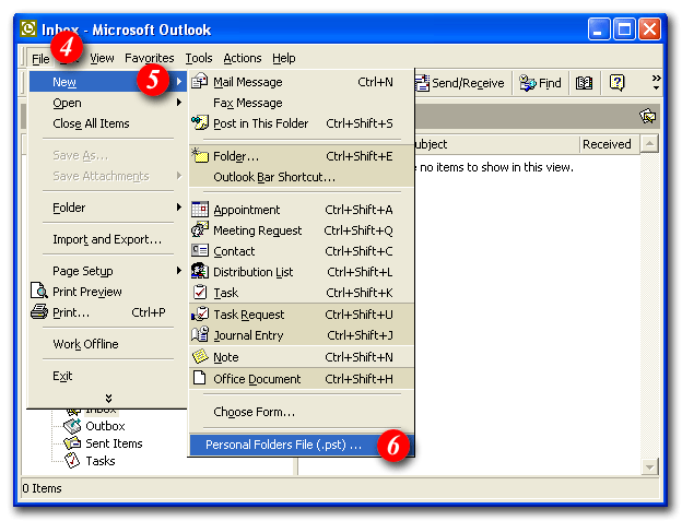 3)At the bottom of the folder list you might also see a directory called 'Personal Folders'. This directory is stored locally on your PC and does NOT count towards your mail quota. If you already have a personal folder setup please click here to skip to the Moving Mail section. If not, please follow the steps below to create a new personal folder file.