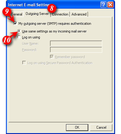 10)Place a dot in the 'Use the same settings as my incoming mail server' option